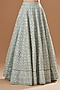 Featuring a pastel blue lehenga in tissue and net base with applique embellishment. It is paired with an off-shoulder blouse and a scalloped dupatta. Accentuate this designer lehenga set with a necklace, dangler earrings and ring for a bridal look.