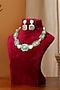 Featuring a gold finish necklace studded with mint kundan polki and zircons, set in copper. It is paired with a matching pair of earrings. Perfect wear for festive occasions or wedding ceremonies.