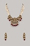 Featuring a gold finish long necklace studded with ruby stone, moissanite and pearls, set in mixed metal. It is paired with a matching pair of earrings. Perfect wear for festive occasions or wedding ceremonies.