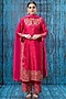 Featuring a pink long kurta in silk base with marodi, resham thread, tikki and zardosi jaal embroidery, including handcrafted tassels. It is paired with matching palazzo pants and a dupatta.