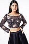Featuring a navy blue ruched lehenga in crepe and silk base. It is paired with a matching sequins-embroidered blouse.