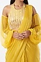 Featuring a yellow saree in silk and net base with embroidery. It is paired with a matching blouse and two separate sleeves.
