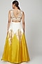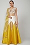 Featuring a mustard and white chevron lehenga I in taffeta base with hand embroidered motifs. It is paired with a matching blouse and a net dupatta.