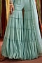 Featuring a mint green cape in georgette base with resham, pearl, beads and thread embroidery. It is paired with matching tiered sharara pants and a satin bustier.
