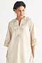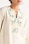 Featuring an off-white top in pure handloom cotton base with bell sleeves, overlapped v-neckline, lace and floral cross-stitch embroidery. It is paired with matching pants.