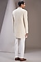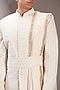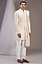 Featuring an ivory sherwani in faux silk base with boota print and machine embroidery. It is paired with a matching kurta, pants, dupatta and belt. Perfect wear for a wedding, engagement or reception ceremony.