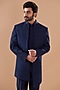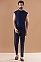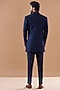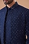 Featuring a navy blue indowestern jacket in faux silk base with salli and thread embroidery. It is paired with a matching vest and pants.
