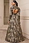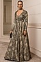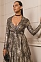 Featuring a metallic black flared gown in foil jersey base with a bow and cape sleeves.