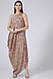 Featuring a beige one shoulder dress in cotton silk base with digital print and mirror embroidery. It is paired with a matching cardigan.