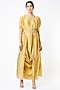 Featuring a mustard cowl gown in tussar silk base with bandhani detailing. It is paired with a matching kimono cardigan and an embroidered circular belt.