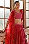 Featuring a pink jacket in tabby silk base with print. It is paired with a shimmer printed lehenga and a bustier. Accentuate it with heavy jewellery and heels for festive occasions or wedding ceremonies.