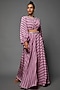 Featuring a purple bustier in cotton silk base with leheriya print, balloon sleeves and hand embroidery. It is paired with matching gharara pants.