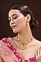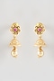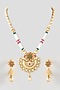 Featuring a gold finish long temple necklace studded with bead hangings, floral motifs, pearl, red and green stone string, set in mixed metal. It is paired with a matching pair of earrings.