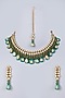 Featuring a gold finish necklace studded with green beads and kundan polki, set in brass and copper base. It is paired with a matching pair of earrings and a maang tikka.