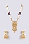 Featuring a gold finish necklace studded with kundan polki and gold beads, set in mixed metal. It is paired with a matching pair of earrings. Perfect wear for festive occasions or wedding ceremonies.