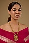 Featuring a gold finish temple pendant necklace studded with gold beads, pearls, red stone and kundan polki, set in mixed metal. It is paired with a matching pair of earrings. Perfect choice for festive celebrations or other Indian festivities.