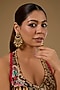 Featuring a pair of gold finish temple chandbali earrings studded with kundan polki, pearls and green gemstones, set in mixed metal. Perfect choice for festive celebrations or other Indian festivities.