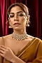 Featuring a gold finish floral choker necklace studded with kundan polki, teardrop stones and pearls, set in brass. It is paired with a matching pair of earrings. This jewellery is perfect for a graceful, sophisticated look, creating a stylish ensemble ideal for weddings, engagement ceremonies or festive gatherings.