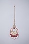 Featuring a gold finish bridal necklace studded with magenta beads and pink stones, set in brass and copper base. It is paired with a matching pair of earrings and a maang tikka.