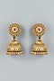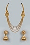 Featuring a gold finish temple long necklace studded with red and green stones, and golden beads mala, set in brass. It is a paired with a matching pair of earrings.
