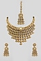 Featuring a gold finish choker necklace studded with white stones and oval drops, set in brass. It is paired with a matching pair of earrings and a maangtikka. This jewellery is perfect for a graceful, sophisticated look, creating a stylish ensemble ideal for weddings, engagement ceremonies or festive gatherings.