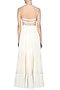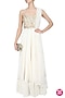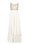Featuring an ivory flared anarkali suit in chiffon ghera and raw silk bodice hand embroidered with gold zardozi, sequins and beads floral work on the front and back along with strappy sleeves and triangular cutout detailing on centre front. It is paired with an ivory net dupatta with white lace border and bootis scattered all over. It comes along with ivory lycra churidaar pants.