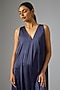 Featuring a blue A-line jumpsuit in satin base with a v-neckline, side pockets and zipper closure. Style it with statement earrings, metallic heels, and a sleek bun for evening parties or a cocktail soiree.