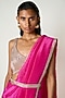 431-88 by Shweta Kapur presents a blush pink blouse in silk base with a deep v-neckline, curved hemline, nakli and micro beads hand embroidery in a chevron pattern. Style it with a saree, a sling bag and heels for a cocktail, sangeet or engagement ceremonies.