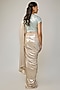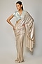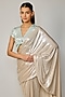 Featuring a champagne draped saree in metallic jersey base. Accentuate it with a blouse, dangler earrings and heels for a festive occasion or family gatherings.