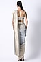 Featuring a gold and ice blue ombre pre-draped saree in silk and pleated metallic base with foil detailing and an attached petticoat. It is paired with a blouse having a deep square neckline, sequins and bead embroidery. Accentuate with heels and chandbali earrings for a pre-wedding ceremony or a boho festive look.