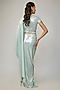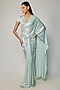 Featuring a mint blouse in liquid jersey base with a V-neckline and front knot detail. Style this blouse with a plain draped saree for a wedding or sangeet ceremony, exuding charm and elegance with minimalistic jewellery.