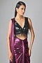 Featuring a purple saree in liquid jersey base. Accentuate it with a blouse, statement jewellery and heels for festive wear.