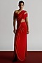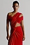 Featuring a red blouse in korean jersey and race crepe base with an off-shoulder neckline, ruched sleeves and hook-eye closure. Accentuate it with a satin draped saree, zircon jewellery, heels and a clutch for a sangeet, award shows or cocktail soiree.