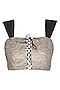 Featuring a cream bustier in satin base with hand embroidered chrome sequins all over the front and back. The straps have a black drawstring detail. It closes at the back with hooks.