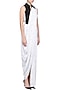 Featuring a white signature draped saree in microdot crepe with the splatter print all over that closes in the front with buttons.