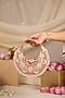 Featuring a gold handbag in brocade base with pearl and thread work. It has a dupion lining and a structured handle. Carry it with a richly embroidered lehenga and classic heels for a stylish ensemble, ideal for wedding functions, festive celebrations or grand occasions.