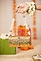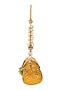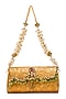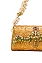 Featuring a gold handbag in metallic base with floral embossment and green crystal beads detailing. It has a pearl embellished handle and multi-colored stone clasp. Carry it with a richly embroidered lehenga and classic heels for a stylish ensemble, ideal for wedding functions, festive celebrations or grand occasions.