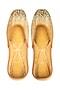 Featuring a pair of gold juttis in leather base with silk and stone embroidery. It has 0.5 inches heels and leather cushion underlining.