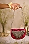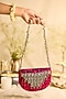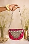 Featuring a magenta and black sling bag in jacquard base with kutchi style embroidery. It has a dupion lining and a silver chain. Carry it as a statement piece with traditional attire for weddings, events, or festive celebrations.
