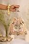 Featuring a pink potli bag in brocade base with gota patti, beads, floral tassels and ghungroo embellishments. It has a dupion lining and a braided silver gota-patti handle. Carry it as a statement piece with traditional attire for weddings, events, or festive celebrations.