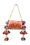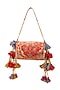 Featuring a red handbag in brocade base with embroidery, tassels and gilded detailing. It has a dupion lining and a chain handle. Carry it with a richly embroidered lehenga and classic heels for a stylish ensemble, ideal for wedding functions, festive celebrations or grand occasions.