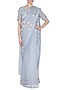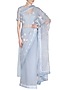 Featuring a light blue saree in silk organza and silk chiffon base with pleated border, flying swan motif patch work, beads and dori embroidery. It is paired with matching blouse in jacquard chanderi base.