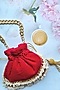 Featuring a magenta potli in velvet base with pearl embellishments. It has a velvet lining and a gold chain handle.