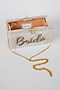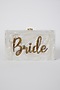 Featuring a white marble box clutch in resin base with bride engraved in glitter and multi colored stones. It has a long sling chain and a velvet underling.