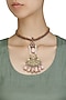 Featuring a 24k gold leafing necklace with swan pendant at the centre encrusted in red and green kempstones and pink opal danglers, set in silver metal.