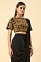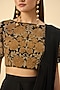 Featuring a black cowl draped skirt saree in pure silk crepe base. It is paired with a gold embroidered blouse. Accentuate it with dangler earrings and heels for a festive gatherings or family dinner.