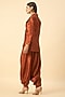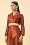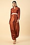 Featuring a copper brown blazer in matka silk base. It is paired with pants and an embroidered belt. Accentuate it with dangler earrings and heels for a festive occasion.