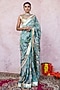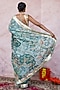 Featuring an ice blue kalamkari saree in silk base with lampi border detail, pitta embroidery, mirror and sequins work. It is paired with a lampi blouse. Pair it with a choker necklace and heels for a daytime wedding or festive occasion.