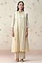 Featuring a yellow and peach striped jacket in handwoven chanderi base with floral hand embroidery and hand block print. Accentuate it with a top, pants, hoop earrings and flats for brunches, casual outings or a sundowner.