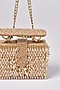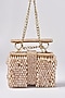Featuring a beige handbag in suede base with shimmery crystals, hand embroidery, and adjustable double chain handle. It has a suede lining.